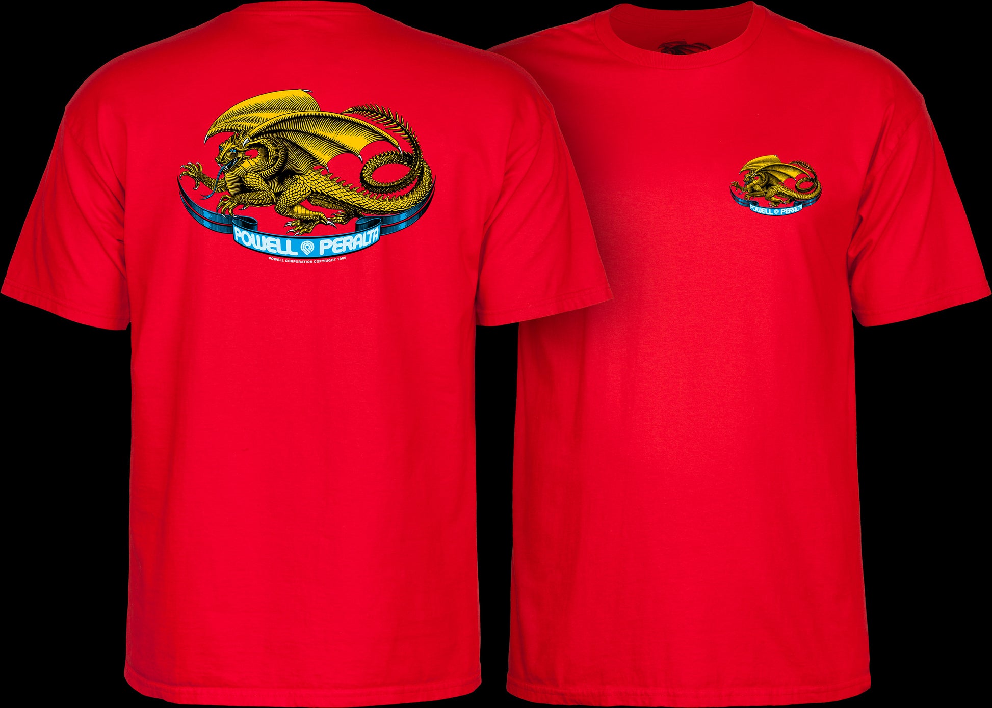 Inspired by Lord of the Rings, George Powell asked artist VC Johnson to work on creating a new dragon graphic in 1980. He suggested designing it in a logo-like oval shape since its intended use was for stickers and t-shirts. The graphic was finalized during the Gold Cup contest series and both Caballero and McGill rocked the graphic on their boards at the Upland Finals. The Oval Dragon was used on a price point series of decks and assemblies and also became the official top graphic for all Powell-Peralta decks until it was replaced in 1987 by the Winged Ripper graphic.
