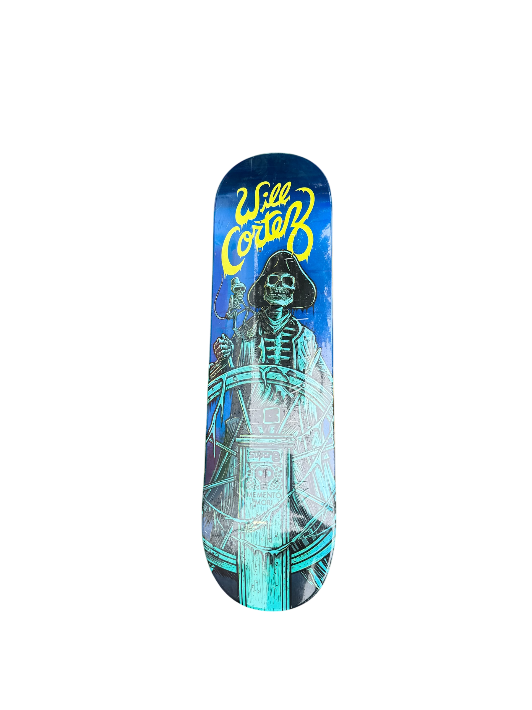 The Will Cortez Pro Momento Mori Pro Model is a popsicle shape deck with traditional 7-ply construction featuring the Will Cortez Graphic by Tim Baron Art across the bottom.